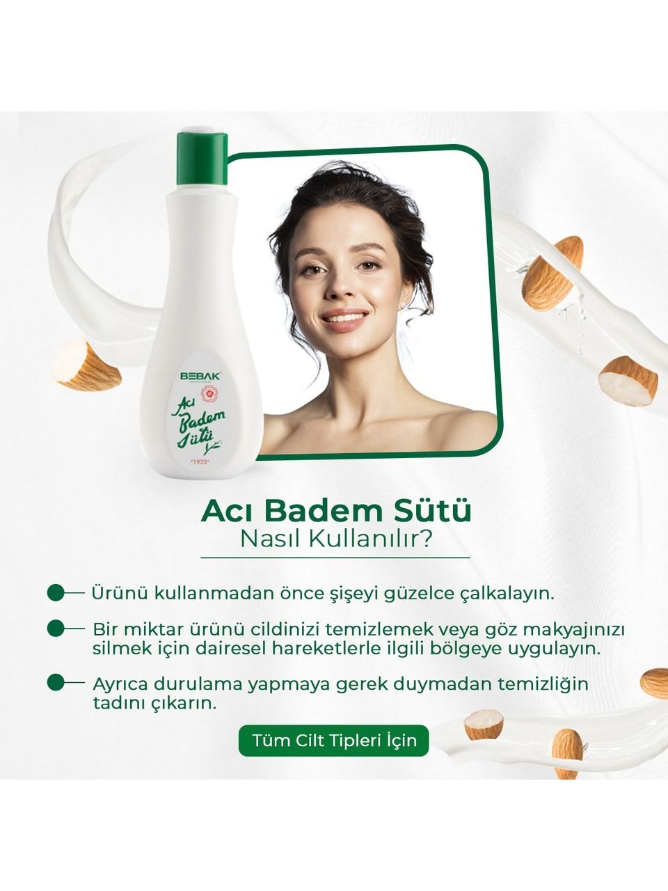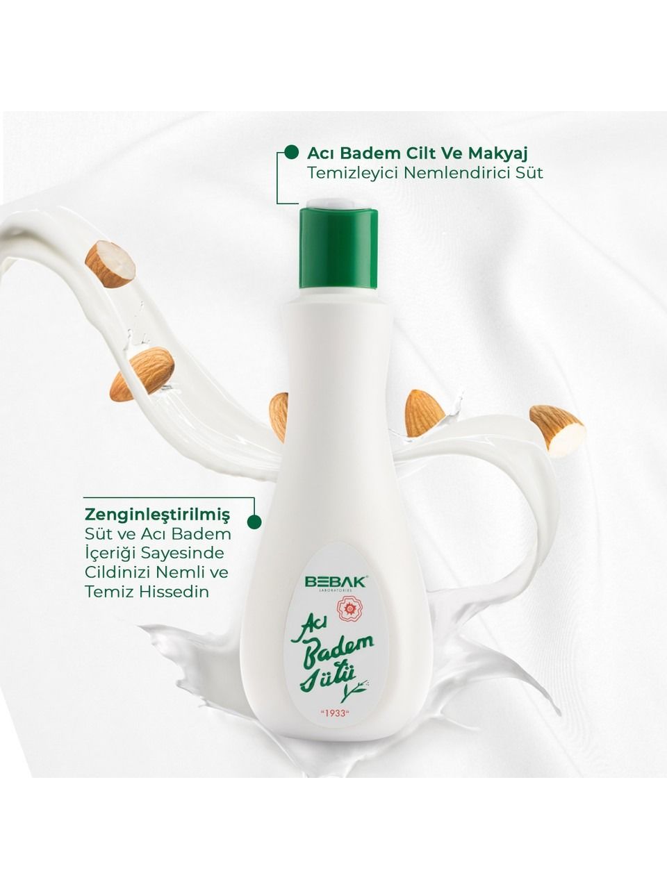 Bebak Acı Badem Makyaj Temizleme Sütü, cildi derinlemesine temizlerken nemlendirir. Günlük makyaj temizliği için idealdir ve cildi yumuşak, pürüzsüz bırakır.