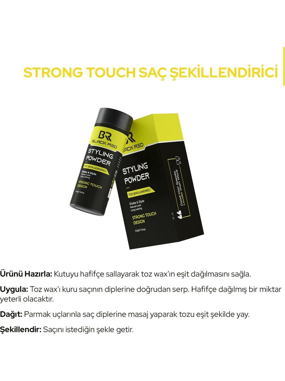 BLACK & RED Natural Ultra Strong Toz Şekillendirici, saçınıza ultra güçlü bir tutuş sağlarken, doğal bir görünüm kazandırır. Saçın hacimli ve dolgun görünmesini sağlar. Günlük ve yoğun kullanım için uygundur, saçınızın gün boyu sabit kalmasına yardımcı olur.