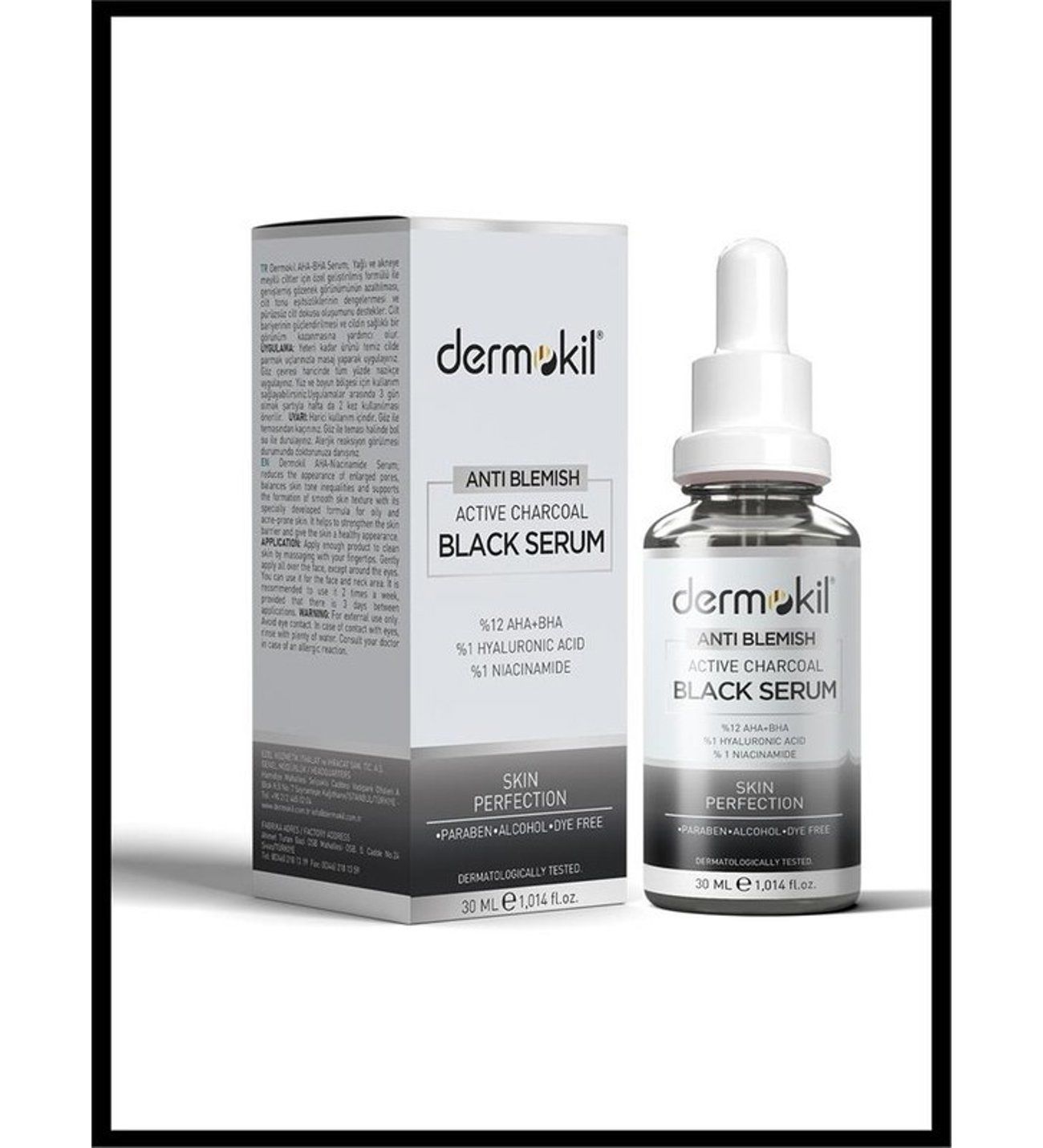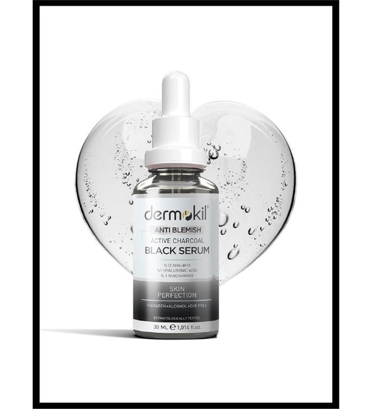 Ürün Açıklaması: Dermokil Black Anti Blemish Active Charcoal Cilt Serumu, ciltteki koyu lekeleri ve hiperpigmentasyonu azaltmaya yardımcı olan etkili bir formüldür. İçeriğindeki aktif bileşenler sayesinde cilt tonunu eşitler ve aydınlatır.