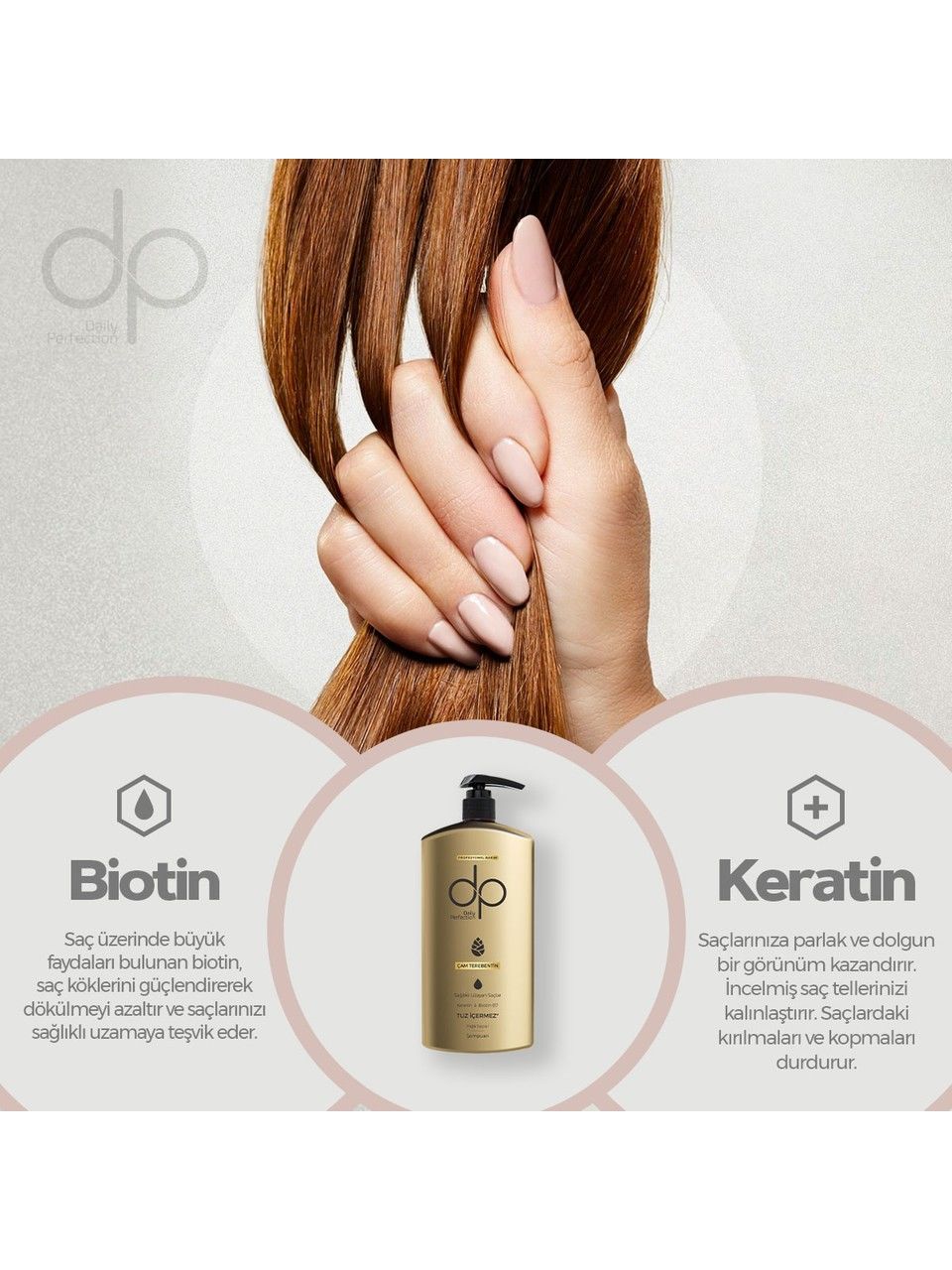 - DP Daily Perfection Çam Terebentin Tuzsuz Şampuan, saç dökülmesine karşı doğal ve etkili bir çözüm sunar. Çam terebentin özü, saç köklerini güçlendirerek saç dökülmesini azaltır ve saçların sağlıklı uzamasına yardımcı olur. Tuzsuz formülü, saçları yıpratmadan nazikçe temizler ve saçların doğal nem dengesini korur. Düzenli kullanımda saçlarınızın daha canlı, dolgun ve güçlü görünmesine katkı sağlar. 425 ml'lik boyu ile uzun süreli kullanım sağlayan bu şampuan, saçlarınızı her yıkamada besleyip canlandırır.