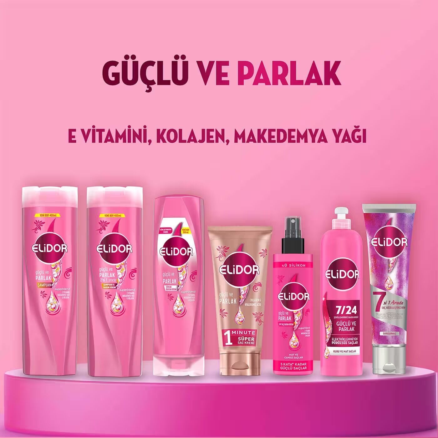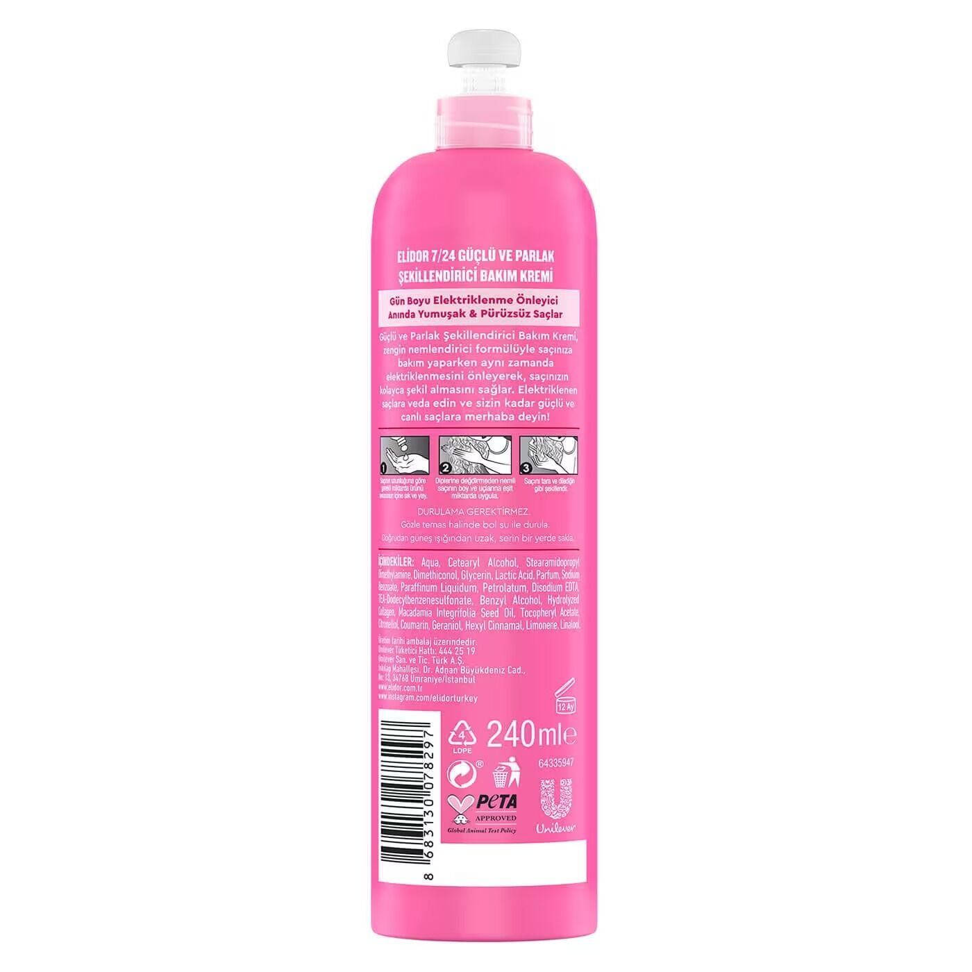 Elidor 7/24 Krem Güçlü Parlak 240 ml, mat ve cansız görünen saçlara günün her anında canlılık kazandırmak için özel olarak geliştirilmiş, durulanmayan bir saç bakım kremidir. Hafif yapısı sayesinde saçları ağırlaştırmadan bakım yapar, saç tellerine parlaklık ve yumuşaklık kazandırır. Gün boyu etkili formülü ile saçlarınızın daha sağlıklı, bakımlı ve güçlü görünmesine yardımcı olur.
