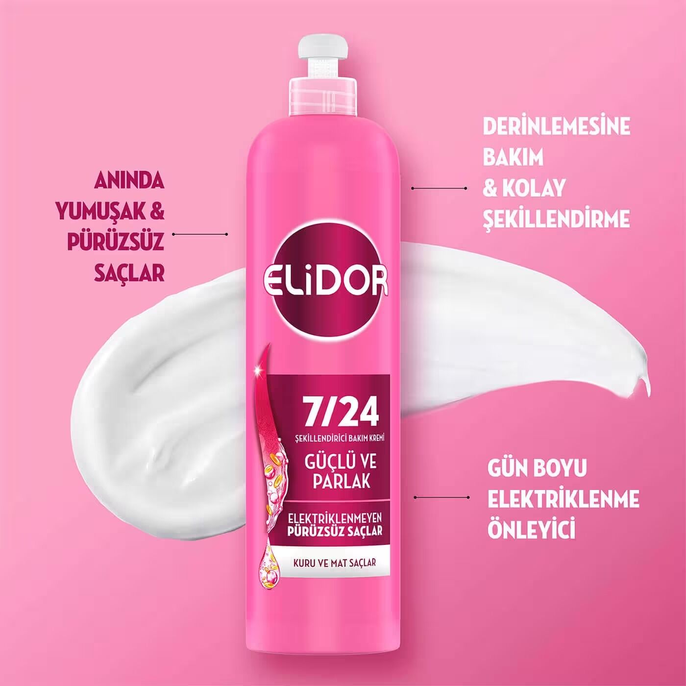 Elidor 7/24 Krem Güçlü Parlak, sadece saçınızı şekillendirmekle kalmaz, aynı zamanda saç tellerini dış etkenlere karşı korumaya yardımcı olur. Düzenli kullanımda saçlar daha kolay taranır, daha pürüzsüz bir yapıya kavuşur ve doğal parlaklığını geri kazanır.