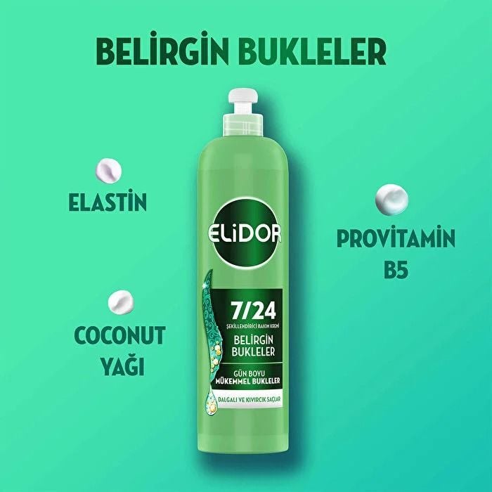 Elidor 7/24 Şekillendirici Saç Bakım Kremi, saçları nemlendirerek belirgin bukleler oluşturmayı destekleyen özel içeriklerle formüle edilmiştir: