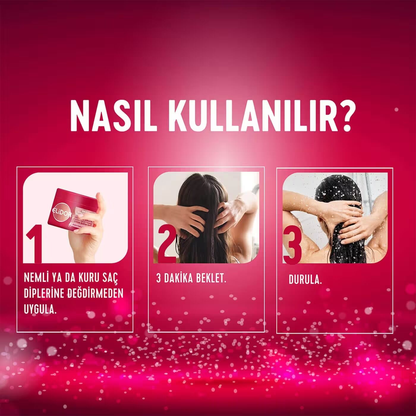 Saçlarınızı şampuanla temizledikten sonra fazla suyunu alın. Elidor Saç Maskesi Brezilya Keratin Terapisi 220 Ml’yi saç boy ve uçlarına eşit şekilde uygulayın. 2–3 dakika bekledikten sonra bol su ile durulayın. Haftada 2–3 kez düzenli olarak kullanılması önerilir.