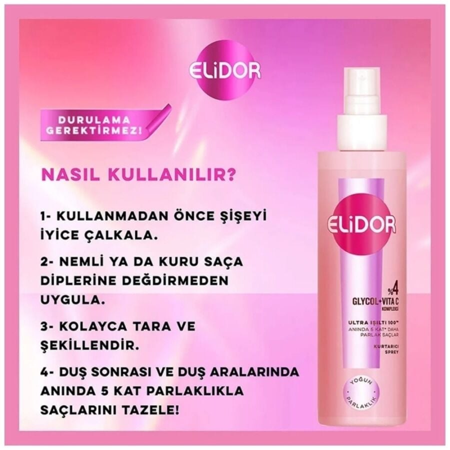 - Elidor Ultra Işıltı Yoğun Parlaklık Saç Kurtarıcı Sprey 200 ml ile anında yoğun parlaklık ve canlılık