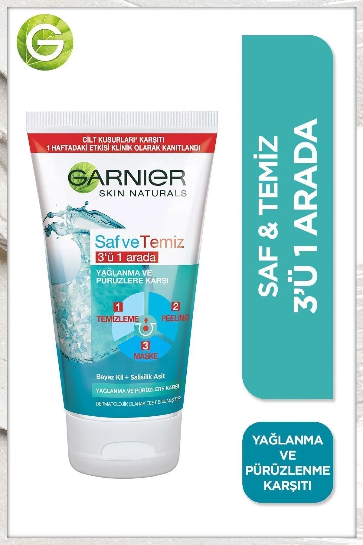 Garnier Saf & Temiz 3'ü 1 Arada Yağlanma ve Pürüzlere Karşı Temizleme Jeli 150 ml, ciltteki fazla yağı temizlemek, cilt pürüzlerini gidermek ve gözenekleri arındırmak için özel olarak geliştirilmiş çok amaçlı bir üründür. Bu jel, peeling, maske ve temizleyici olarak kullanılabilme özelliğine sahip olup cildi derinlemesine temizler ve pürüzsüz bir görünüm sağlar.