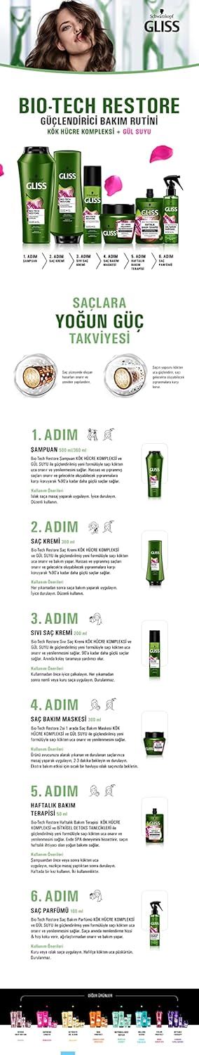 Gliss Bio-Tech Restore Sıvı Saç Bakım Kremi, saçı derinlemesine onaran ve yeniden yapılandıran bir bakım ürünüdür. Bio-Tech Restore teknolojisi ile formüle edilen bu sıvı saç kremi, saçın kırılmasını önler, saçı güçlendirir ve sağlıklı bir görünüm kazandırır. Saç tellerindeki zayıf noktaları onarır ve saçın elastikiyetini artırır. Düzenli kullanımda saçlar daha pürüzsüz, yumuşak ve parlak görünür.