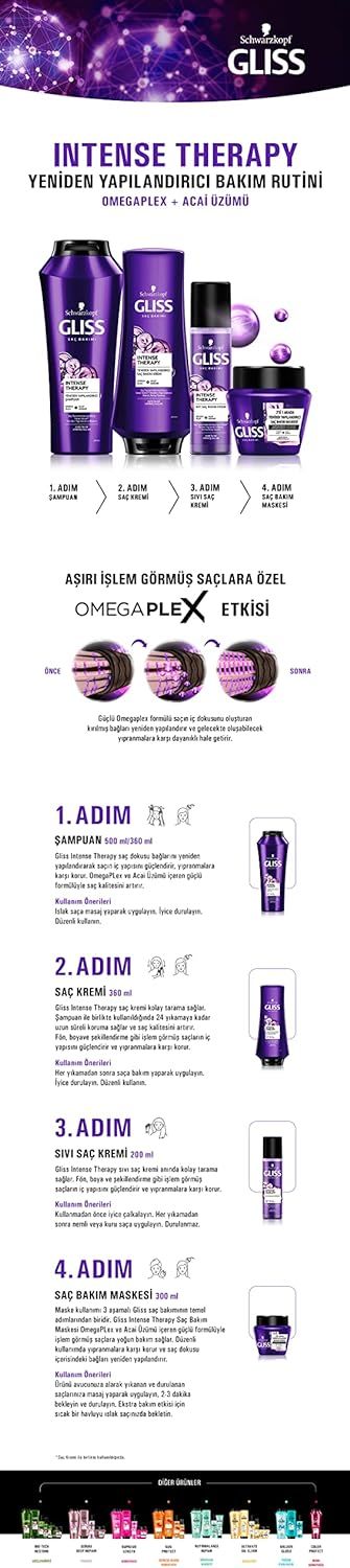 - İyice durulayın. En iyi sonuçlar için Gliss Intense Therapy Saç Kremi ile birlikte kullanılması tavsiye edilir.