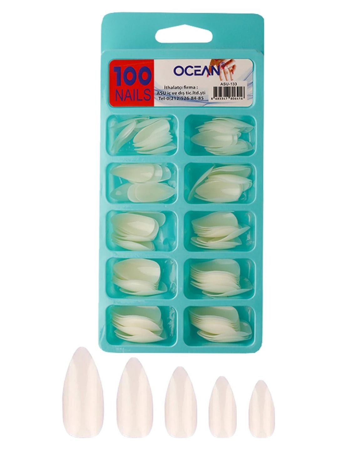 Ocean Solingen, beyaz takma tırnak, badem protez tırnak, ASU-133, 100'lü kutulu tırnak, dayanıklı tırnak modelleri, profesyonel takma tırnak.