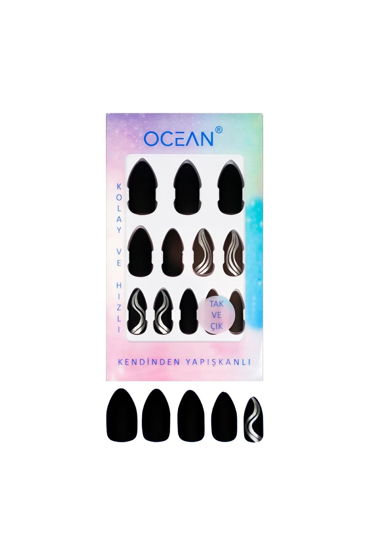 Ocean Solingen Mat Siyah Desenli Takma Tırnak Tak Ve Çık Kendinden Yapışkanlı Takma Tırnak ASU-802 12 Adet