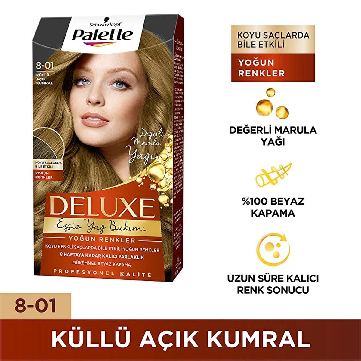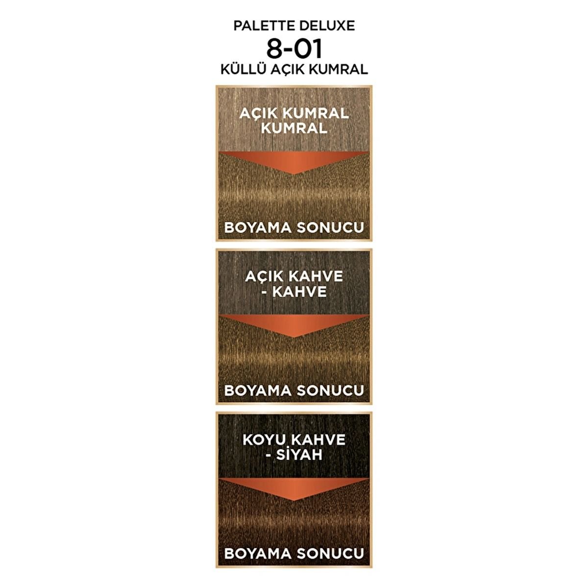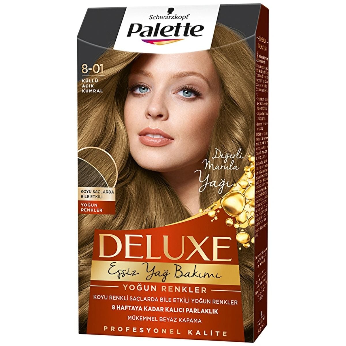 Palette Deluxe Eşsiz Yağ Bakımı Saç Boyası Küllü Açık Kumral 8-01, saçı besleyerek canlı, sağlıklı ve parlak bir renk elde etmenizi sağlar. Soğuk küllü tonlarla doğal bir görünüm sunar.