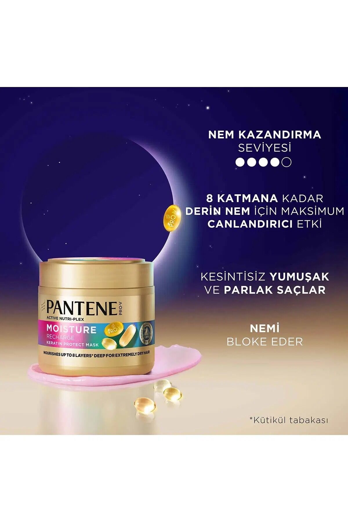 - Pantene Kesintisiz Nem Takviyesi Keratin Koruyucu Maske formülü ile derinlemesine nem desteği