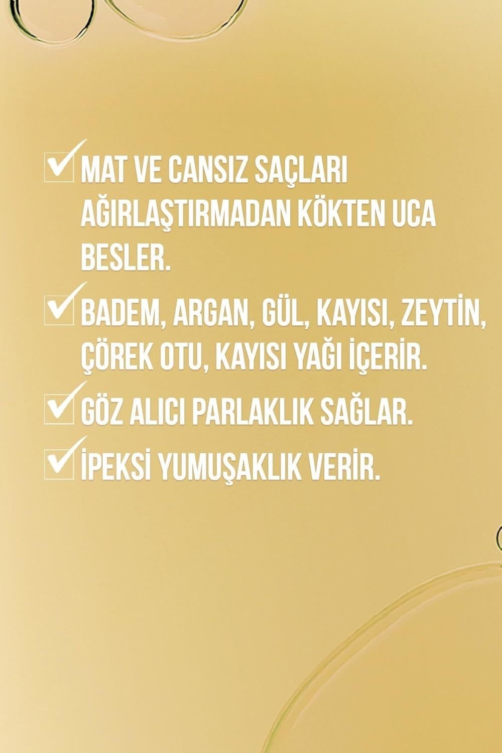 - 7 Farklı Doğal Yağ Karışımı: İçeriğinde bulunan argan yağı, zeytinyağı, badem yağı, jojoba yağı, hindistancevizi yağı, avokado yağı ve susam yağı ile saçlarınızı kökten uca besler ve saçın doğal nem dengesini korur.