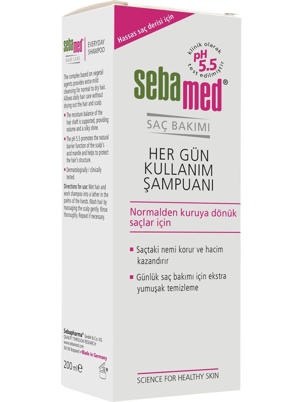 Sebamed Her Gün Kullanım Şampuanı 200 ml, günlük kullanım için özel olarak geliştirilmiş, saç ve saç derisi sağlığını destekleyen nazik bir şampuandır. İçeriğindeki pH 5.5 dengesi, saç derisinin doğal koruma tabakasını koruyarak hassas ciltlerde bile güvenle kullanılmasını sağlar. Saçlarınızı derinlemesine temizler, yumuşatır ve parlaklık kazandırır.