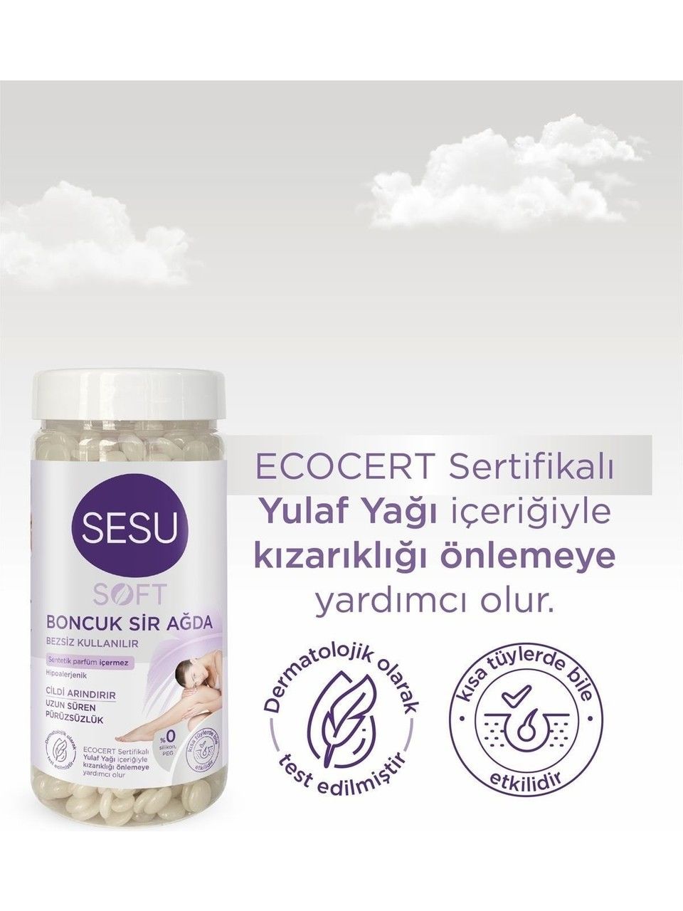 - Sesu Soft Boncuk Ağda, hassas ciltler için özel olarak formüle edilmiştir ve cildinize zarar vermez.