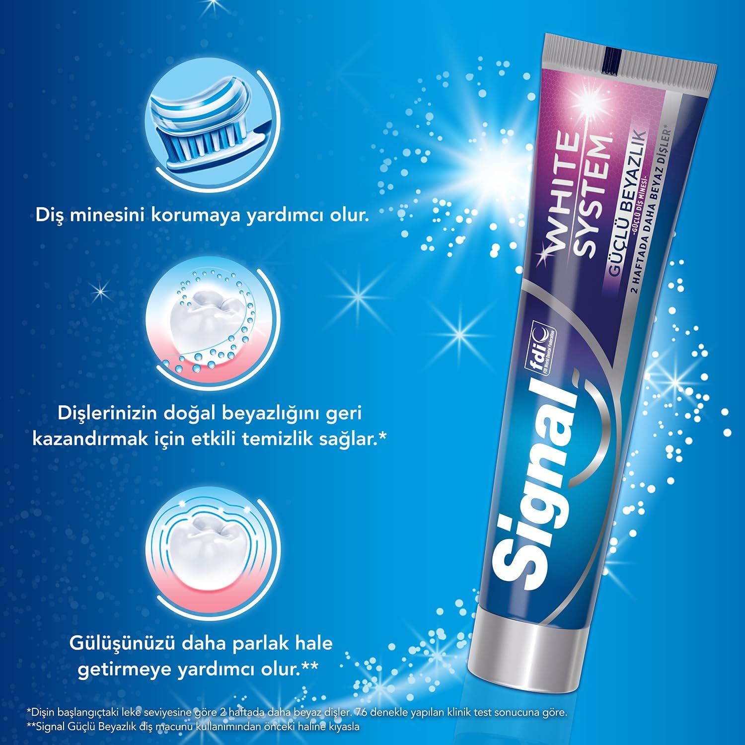 Signal Diş Macunu White System, beyazlatıcı etken maddeler ve florür içerir. Bu formül, dişlerinizin beyazlığını korurken aynı zamanda diş etlerinizi korur ve sağlıklı tutar.
