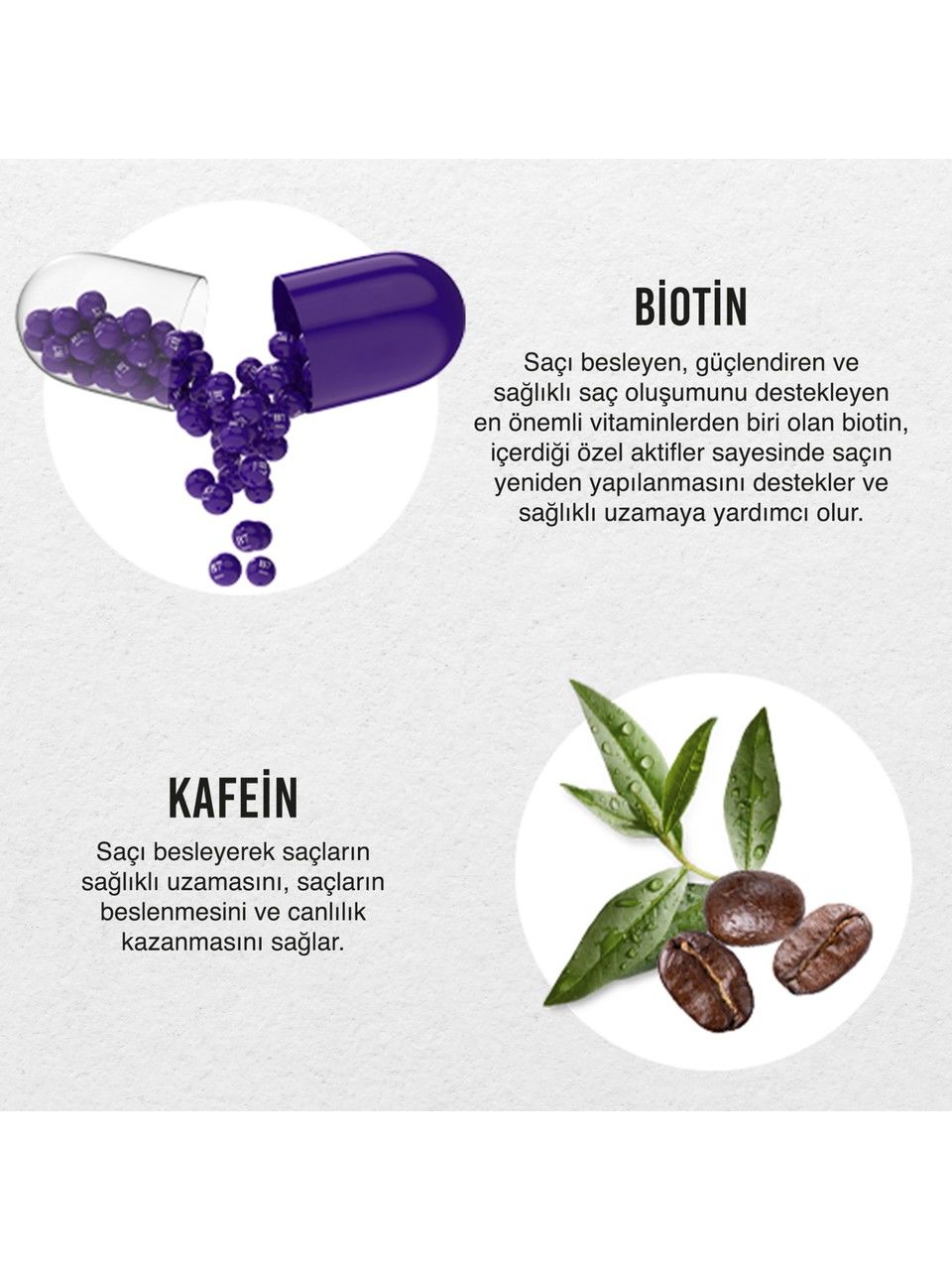 - Biotin ve kafein ile saç dökülmesini azaltır ve saçı güçlendirir.