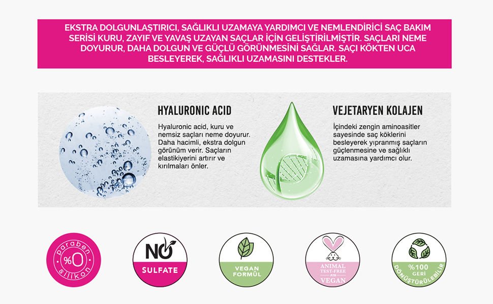 Hyaluronik asit, kolajen, bitkisel özler, doğal yağlar, saç dostu proteinler. Ürün, zararlı kimyasallardan arındırılmıştır.